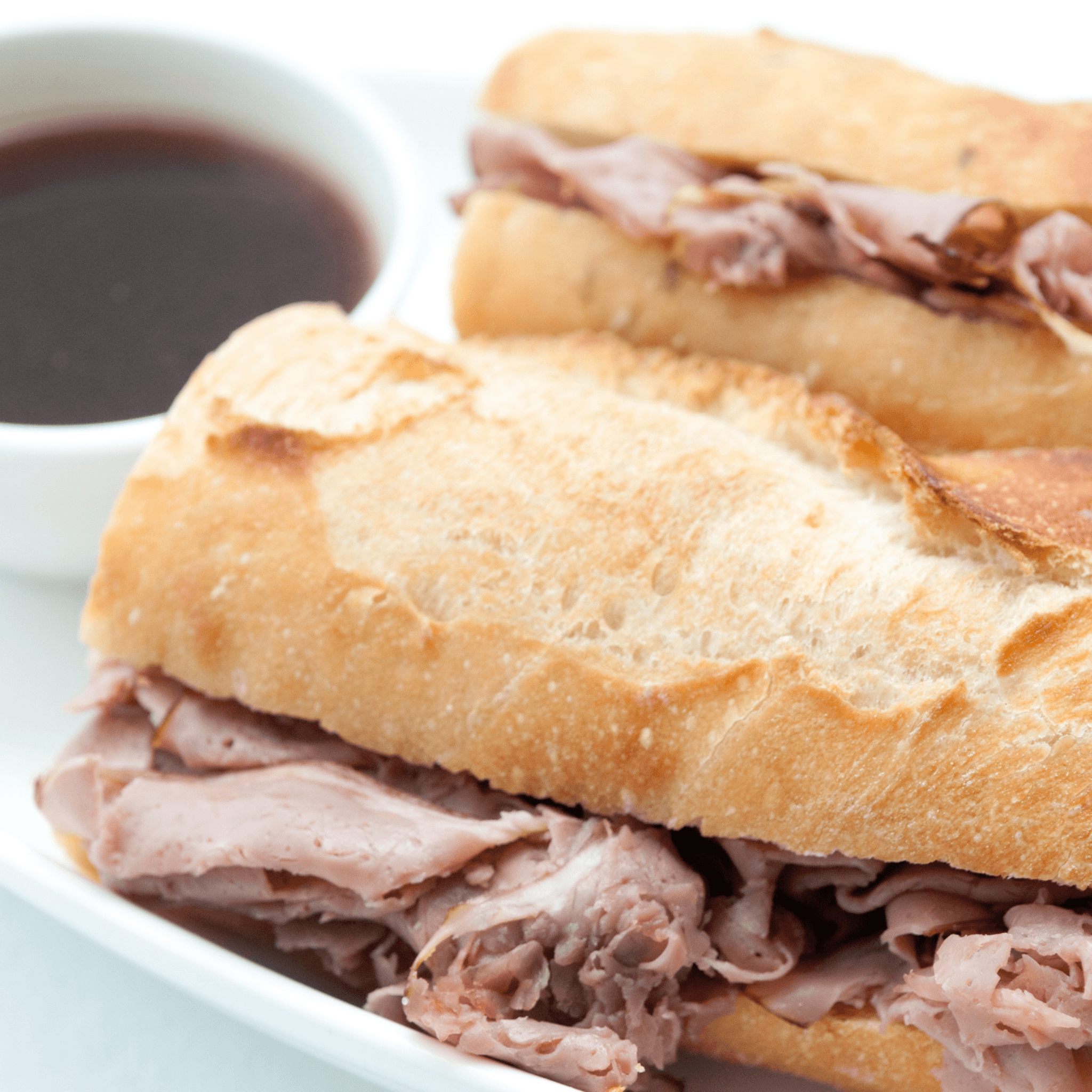 Our take of a popular sandwich-roast beef, ham, pepperjack lite horsey spread, served with au jus